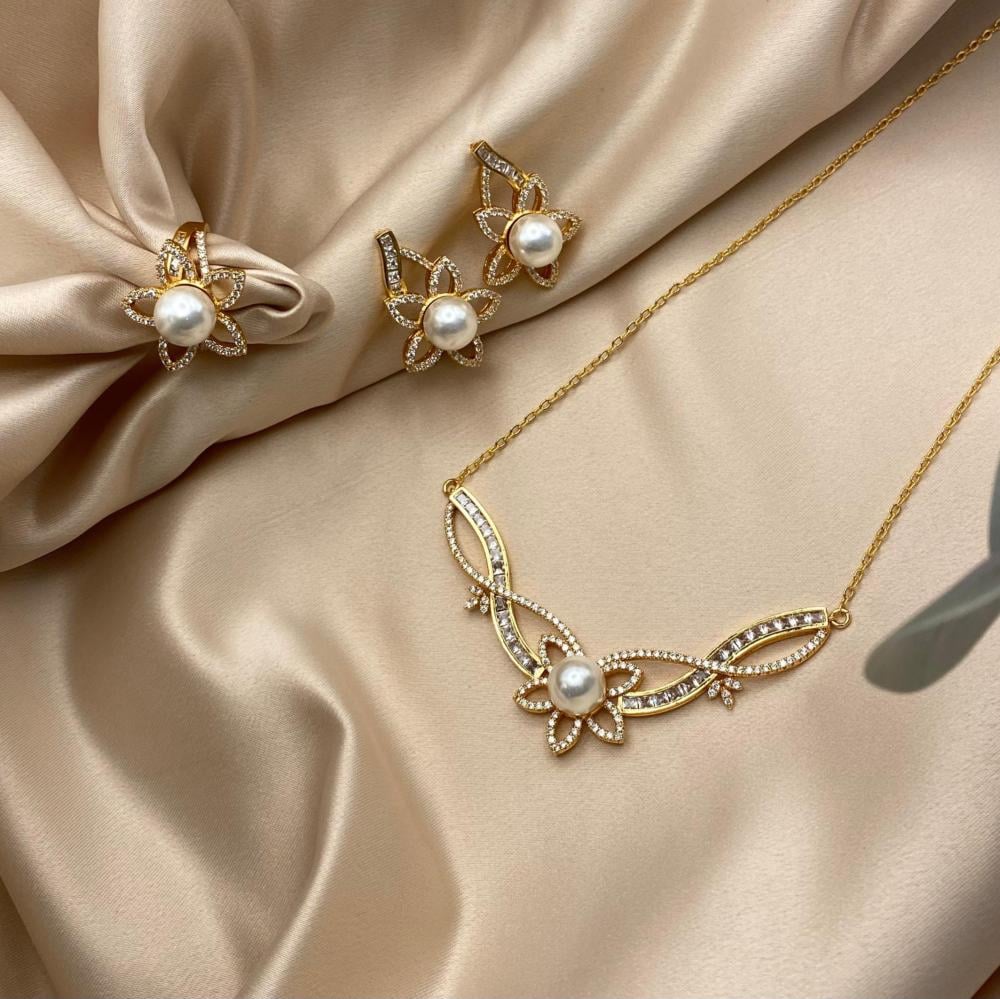 تألقي بجمال لافت مع هذا الطقم النسائي الفاخر المطلي بالذهب، والمزين بتفاصيل أنثوية أنيقة على شكل أزهار مرصعة بفصوص براقة يتوسطها لؤلؤة أنيقة تمنحك لمسة من الرقي والكلاسيكية الفاخرة. يتكون الطقم من قلادة فاخرة، أقراط متناسقة وخاتم أنيق ليمنحك إطلالة متكاملة تبهر الأنظار.
